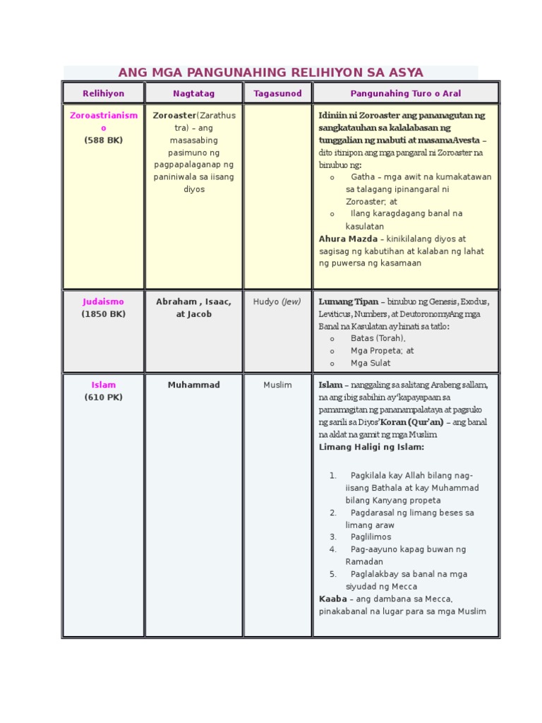 Relihiyon - ay ang pagpapakilala ng isang tao sa kapangyarihang nakakapaghari sa lahat ng bagay at ang kanyang mga batas at utos ay sinusunod. MGA RELIHIYON SA ASYA RELIHIYON BANSANG SINILANGAN NAGTATAG MGA BATAYANG TURO ARAL AT PANINIWALA Hinduismo India Indo-Aryan Naniniwala sila sa karma at Reinkarnasyon. Kamakailan nakita ko ang paggawa ng mga pag-ikot ng paghahanap mula sa Barna Group isang evangelical research organization na nakatuon sa intersection ng pananampalataya at kultura.